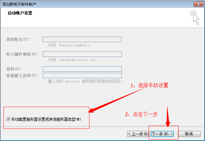 5、选择“手动配置服务器设置或其他服务器类型”,单击“下一步”继续