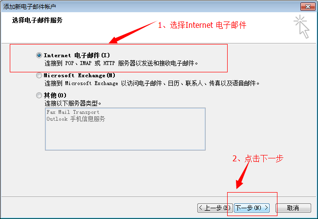 6、选择“Internet 电子邮件”,单击“下一步”继续