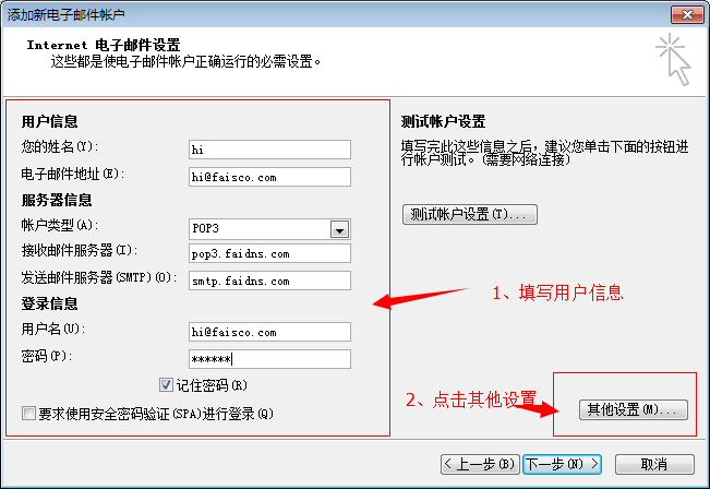 7、在用户信息下输入您的姓名和电子邮件地址,在服务器信息下的接收邮件服务器键入pop3.faidns.com,发送邮件服务器输入smtp.faidns.com,在登录信息下输入用户名和密码(注意,用户名为凡科邮箱账号,密码为凡科网站的员工账号密码),设置完成后单击“下一步”继续