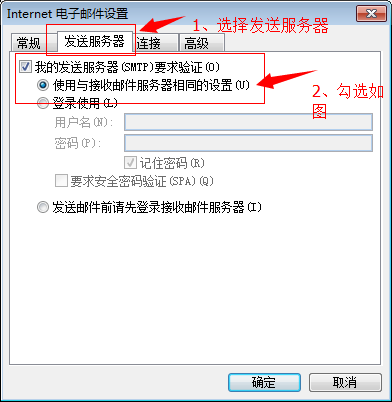 8、单击“其他设置”按钮后,切换到“发送服务器”选项卡,勾选“我的发送服务器要求验证”复选框并选择“使用与接收邮件服务器相同的设置”,然后切换到“高级”选项卡