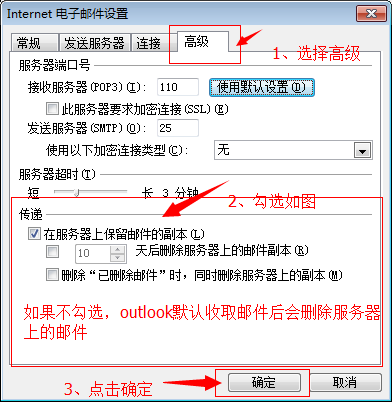 切换到【高级】选卡(注意:如果不勾选,outlook默认收取邮件后会删除服务器上的邮件,而且默认outlook是不勾选的)