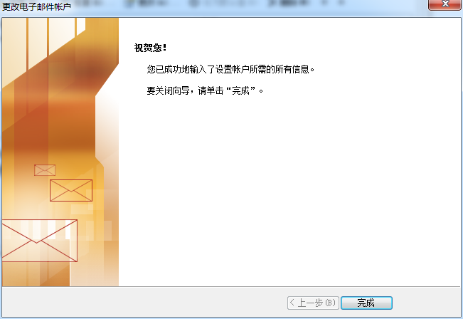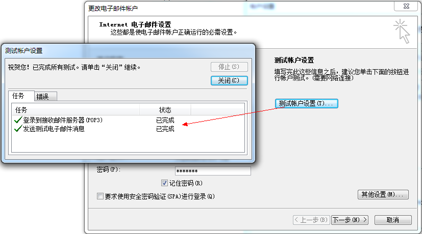 9、单击“测试账户设置”是否正常,如发现错误,点击“关闭”按钮,重新返回界面进行设置